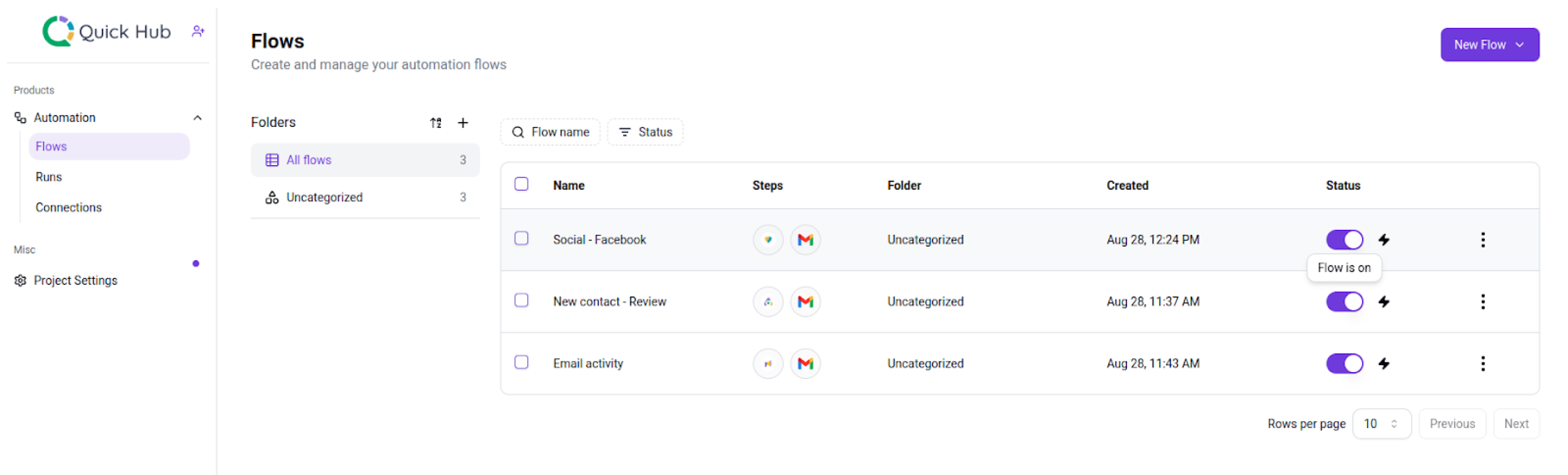 - The Status tab shows how many flows are active, and you can turn them on or off with a toggle.
