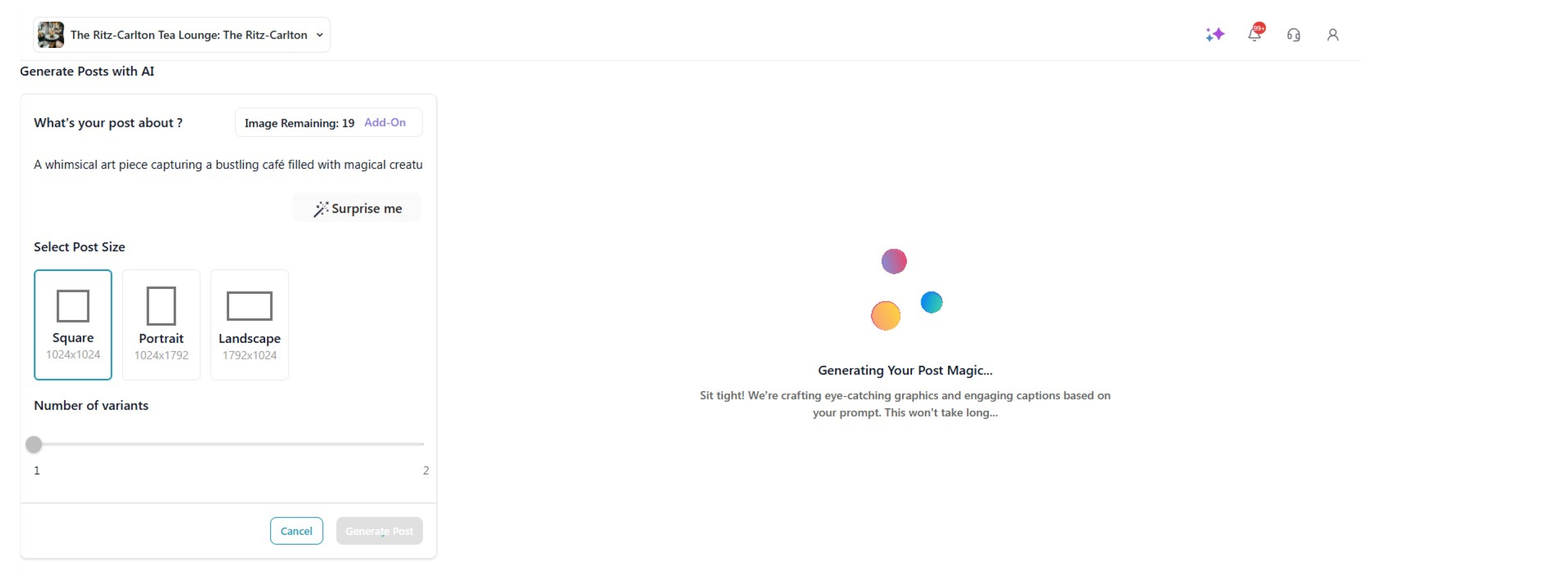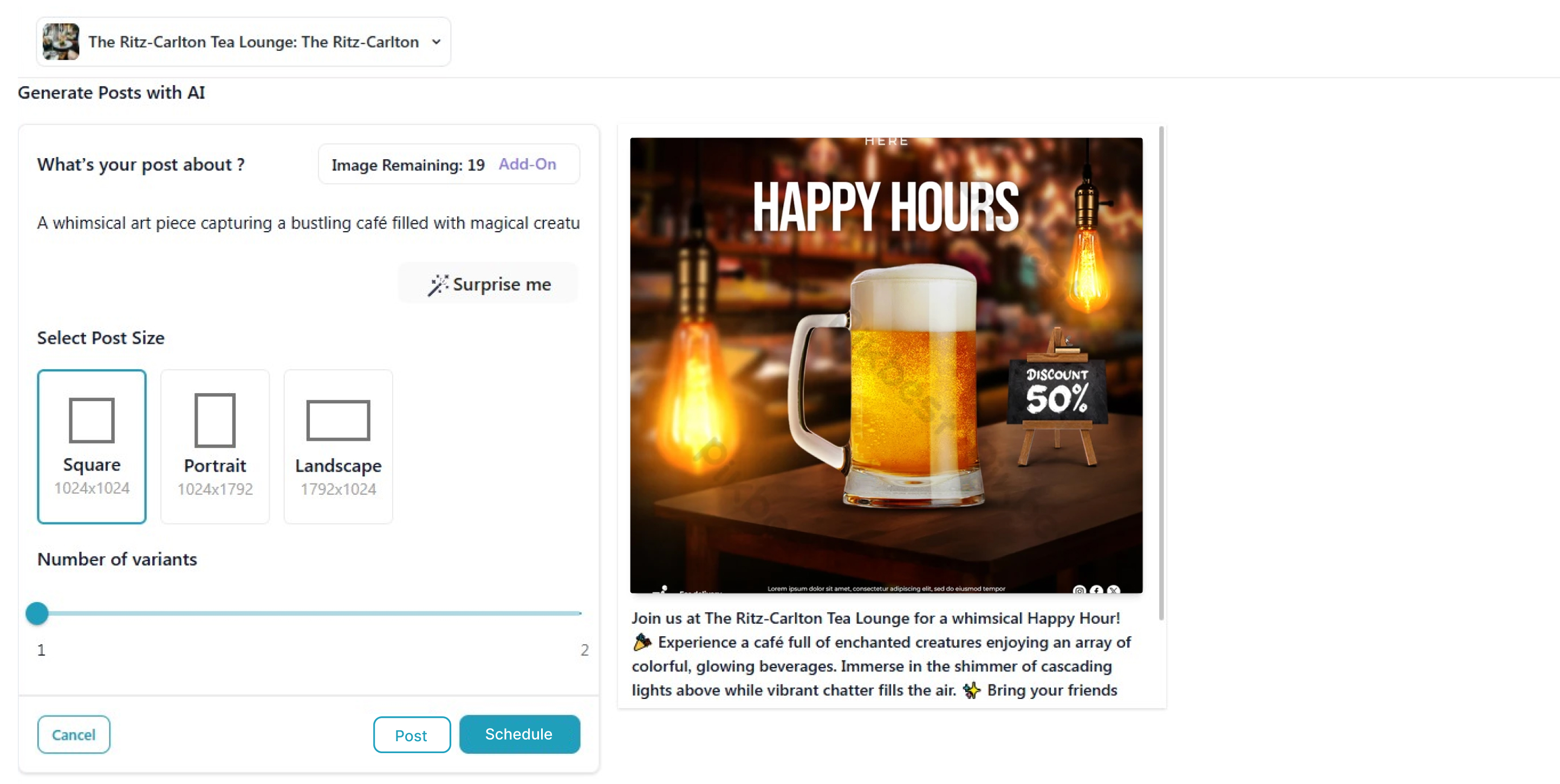 - Enter your keywords, select your desired post size, and specify the number of variants you want to generate.
