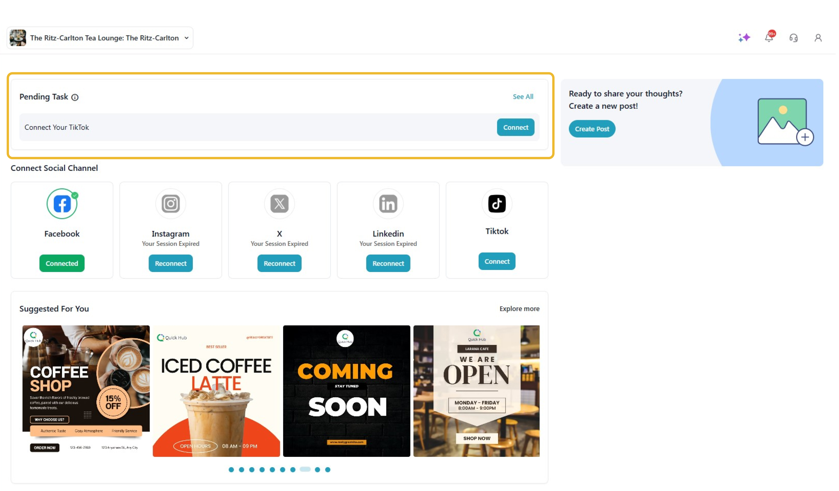 You can now connect your social media accounts (Facebook, Instagram, X, and LinkedIn) to your Quick Hub account by following these steps: