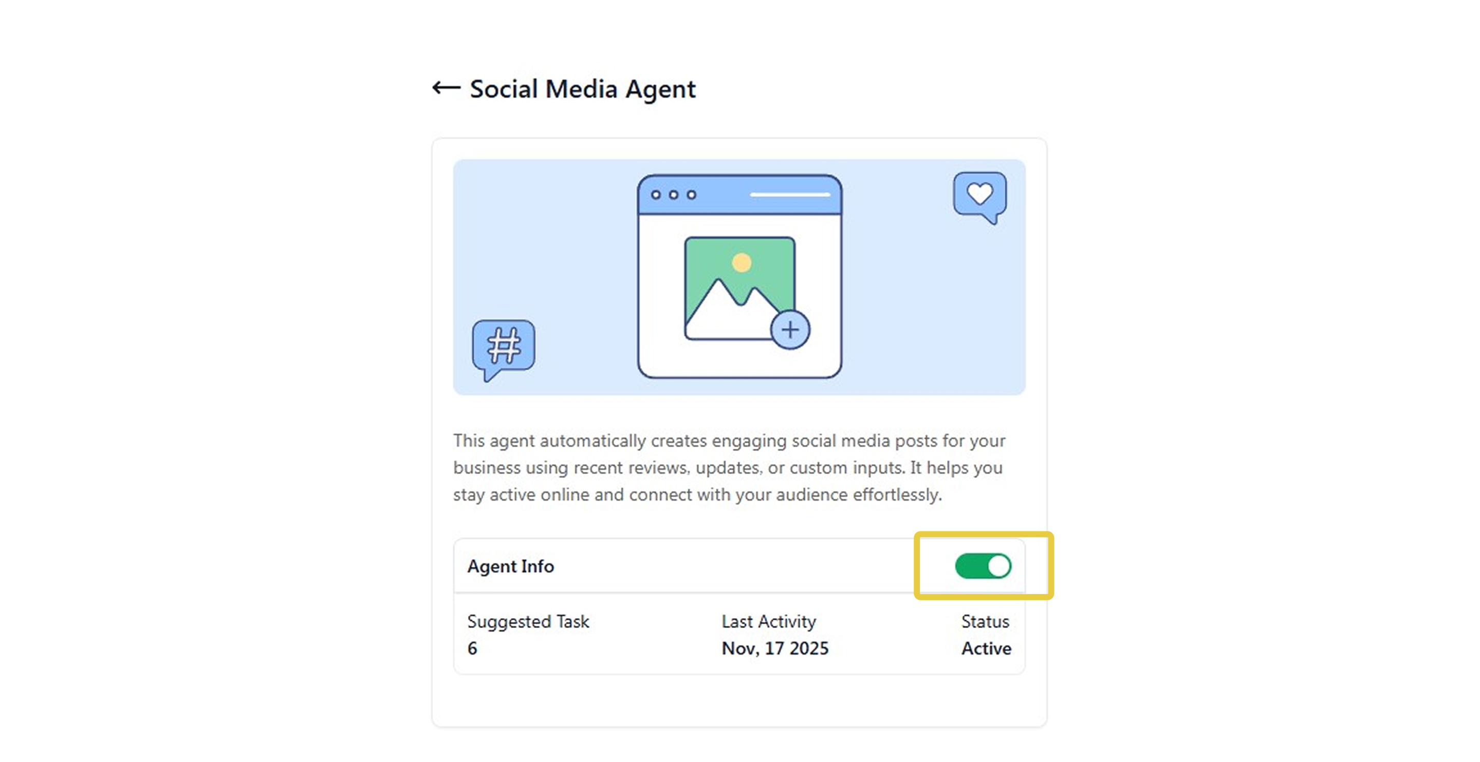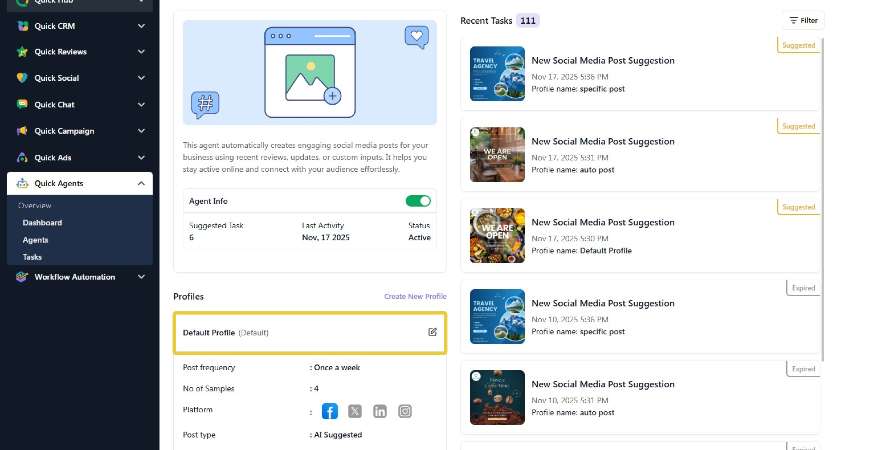 - Your social media agent is now active. The default profile will be active; you can edit the default profile or create a new one. To modify the AI agent details, click Edit.