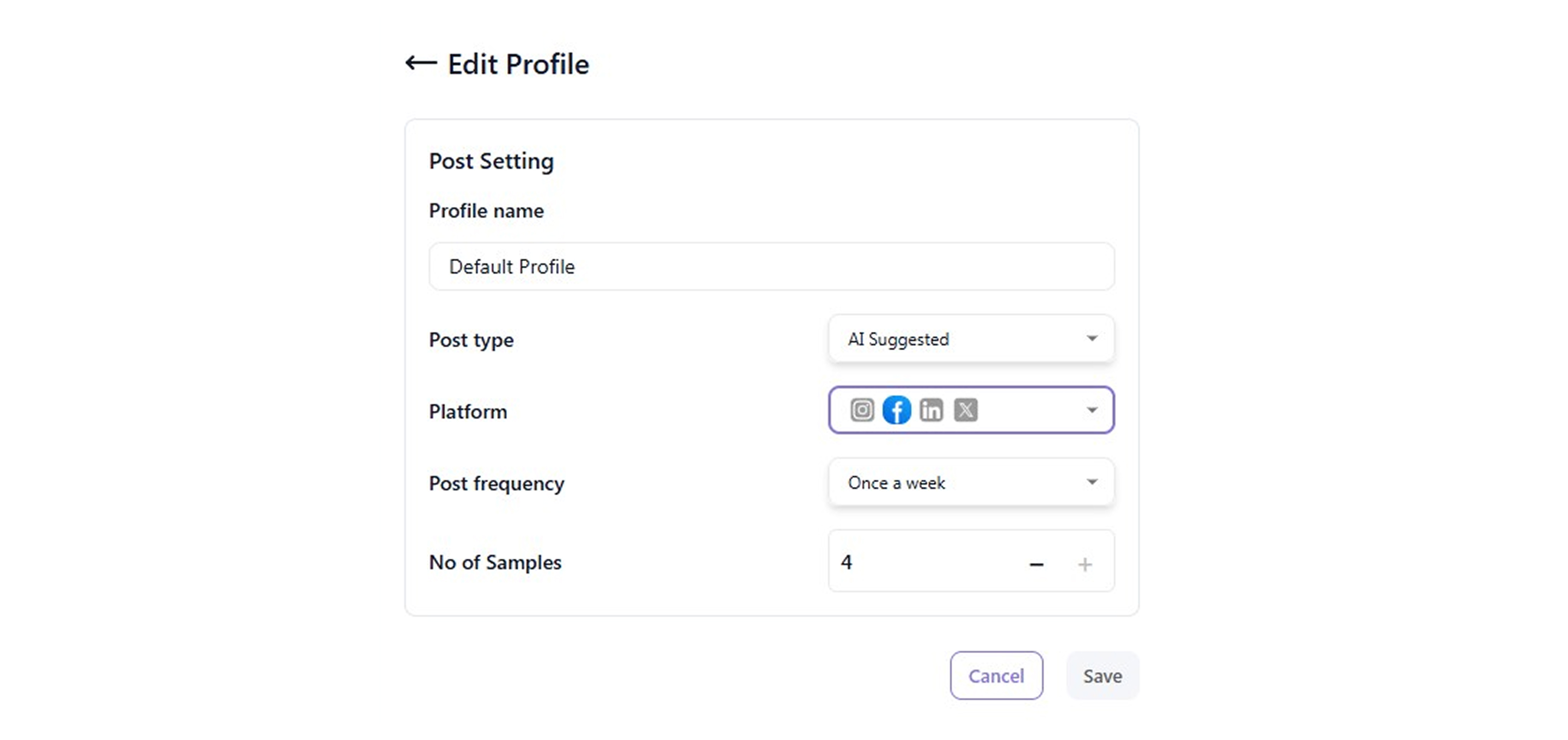 Here, you can change the bot name and adjust the post type (AI-suggested or specific post), platforms, post frequency, and post samples.