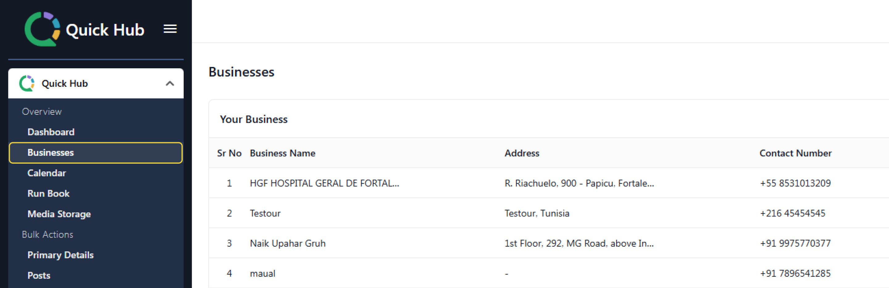 - To view all the businesses under your account, go to the 'Businesses' option under Quick Hub overview.