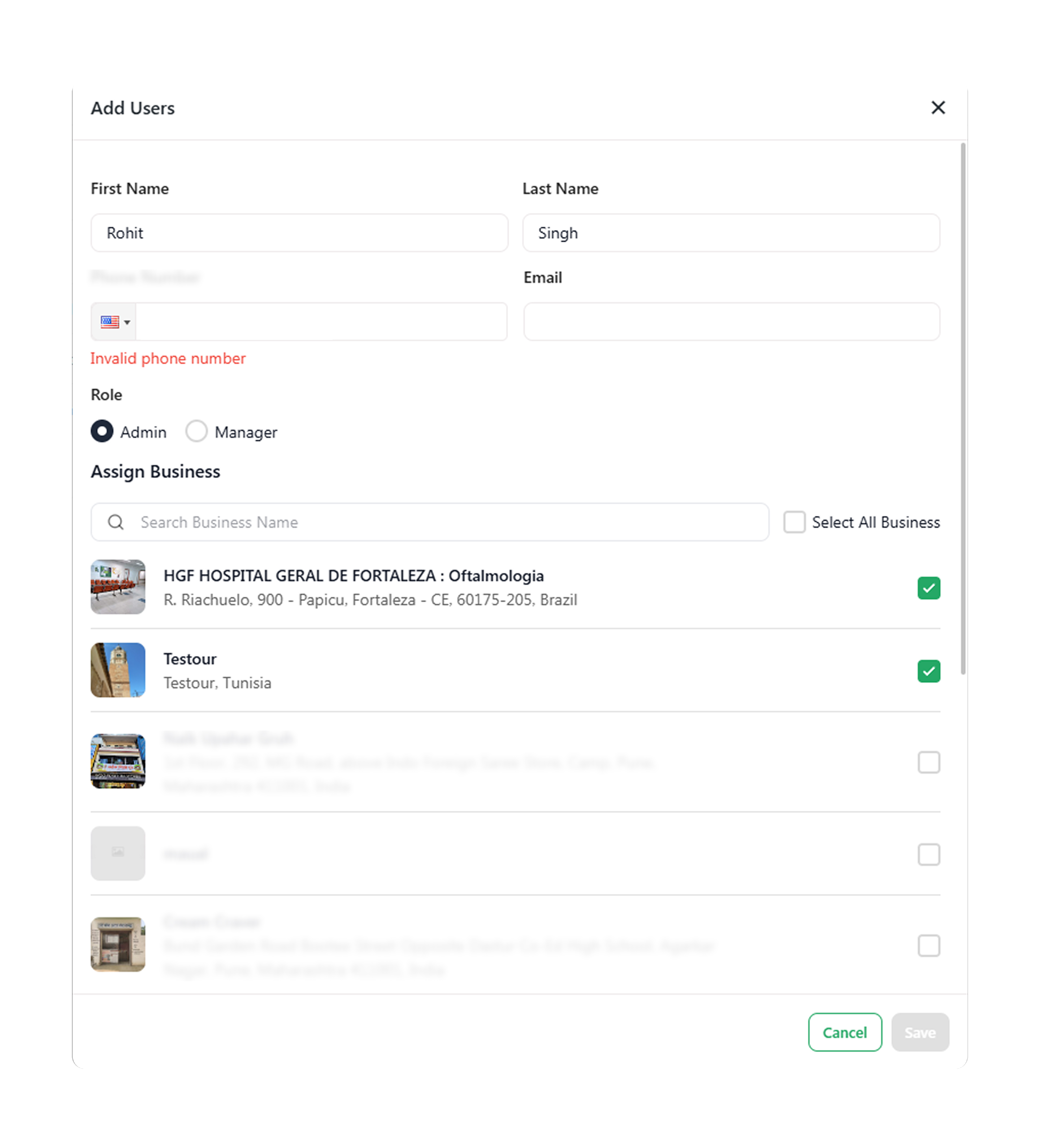 - Enter the user's first and last name, phone number, email, and assign a role.