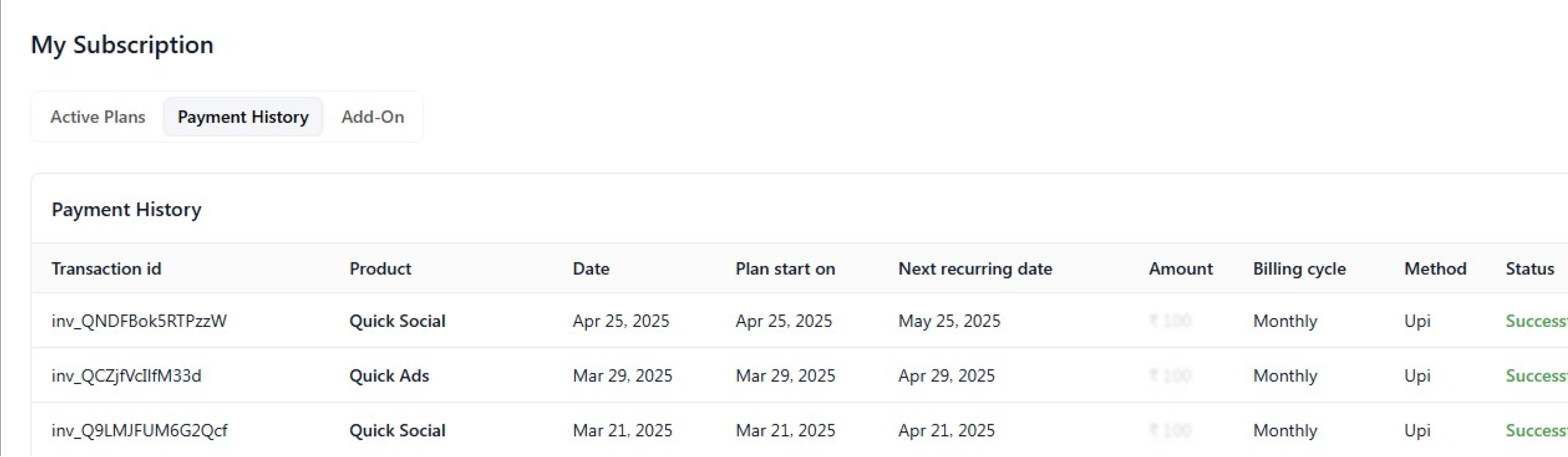 - Here, you will be able to see the transaction ID, product name, date, plan start date, next recurring date, amount, billing cycle, method, status, autopay, and invoice.