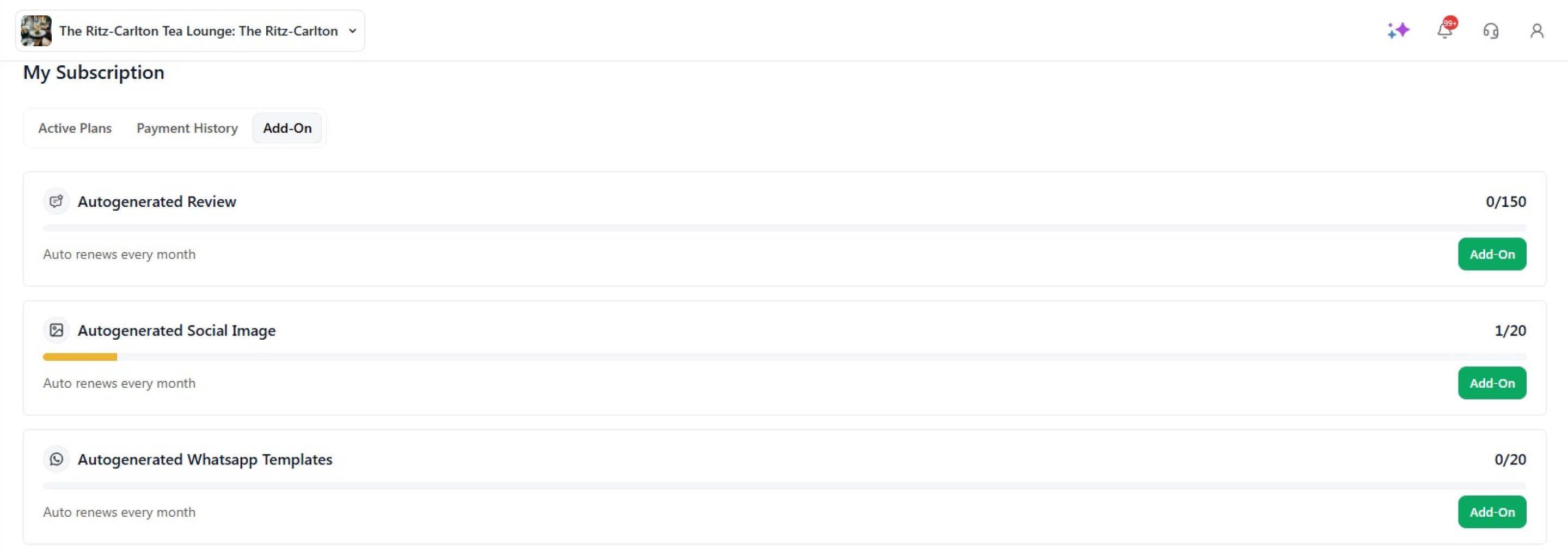 - The "Add-on" tab displays the available add-ons: email, WhatsApp, and auto-generated reviews.