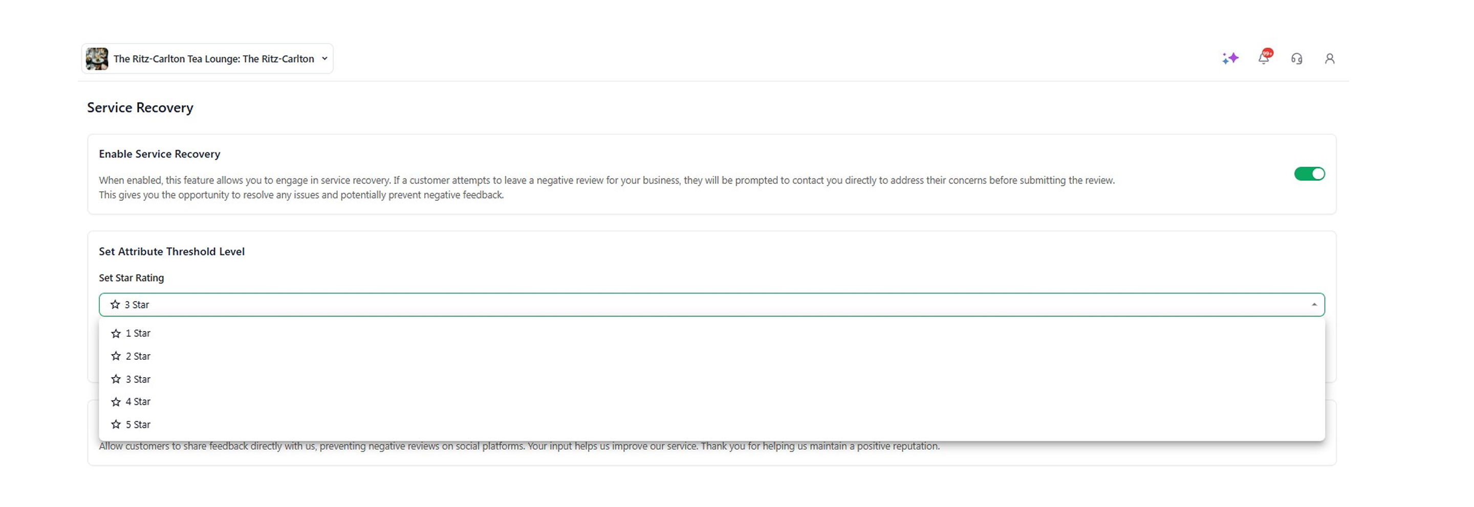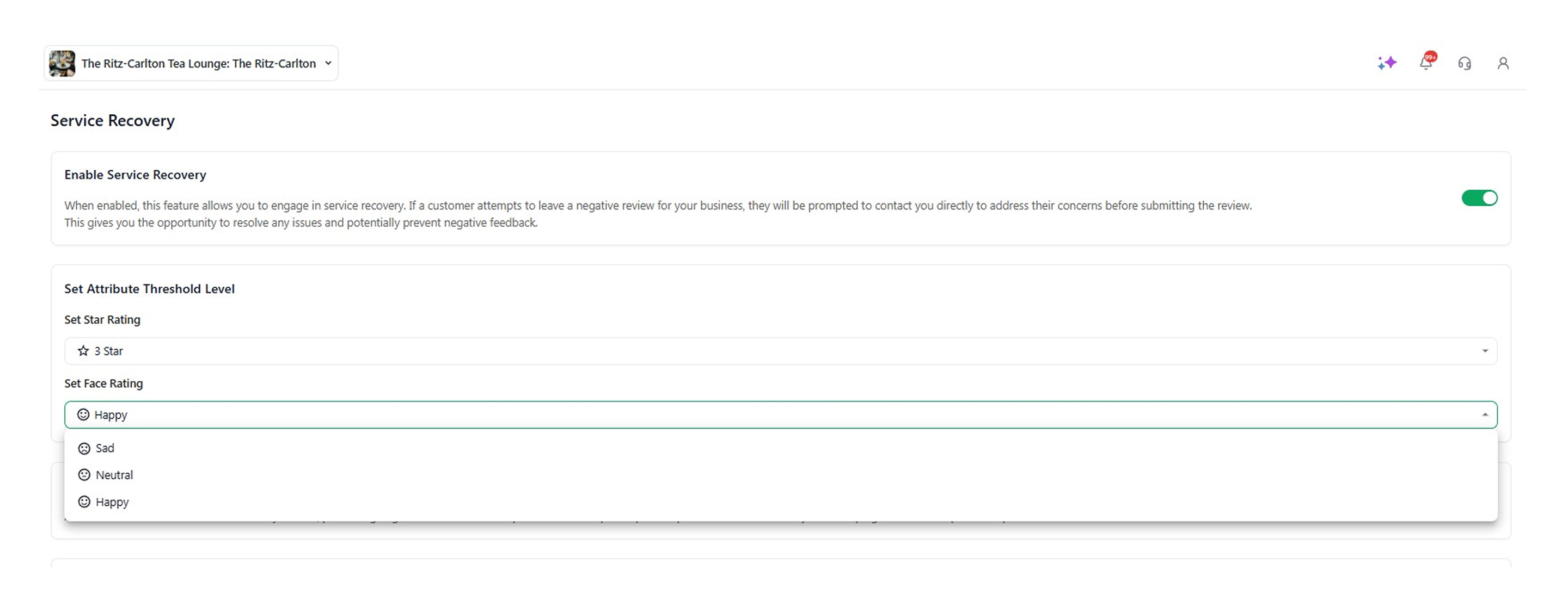 With Service Recovery enabled, customers leaving negative feedback are redirected to contact you directly. This provides a chance to resolve their issue and prevent the negative review from being posted. To enable this setting, follow the steps below: