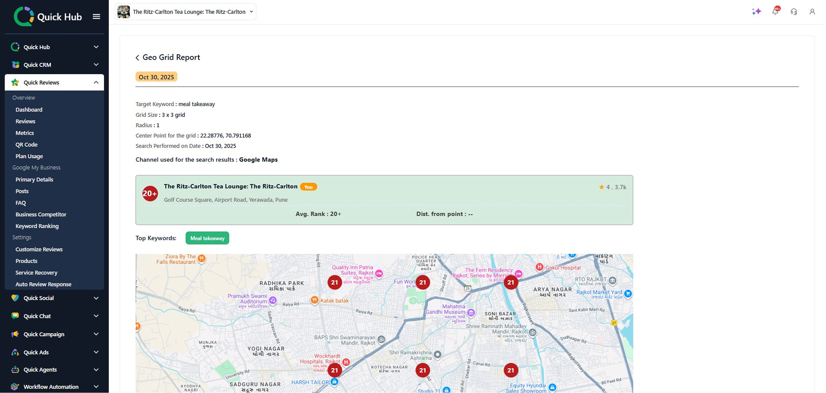 - Here, you can view in-depth details, including target keywords, grid size, radius, center point for the grid, search date, channel, and a list of top competitors along with their business addresses and Google rankings.