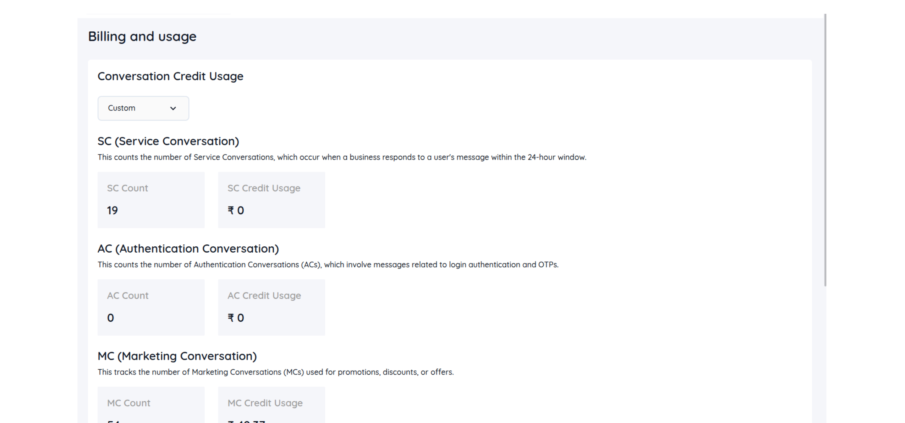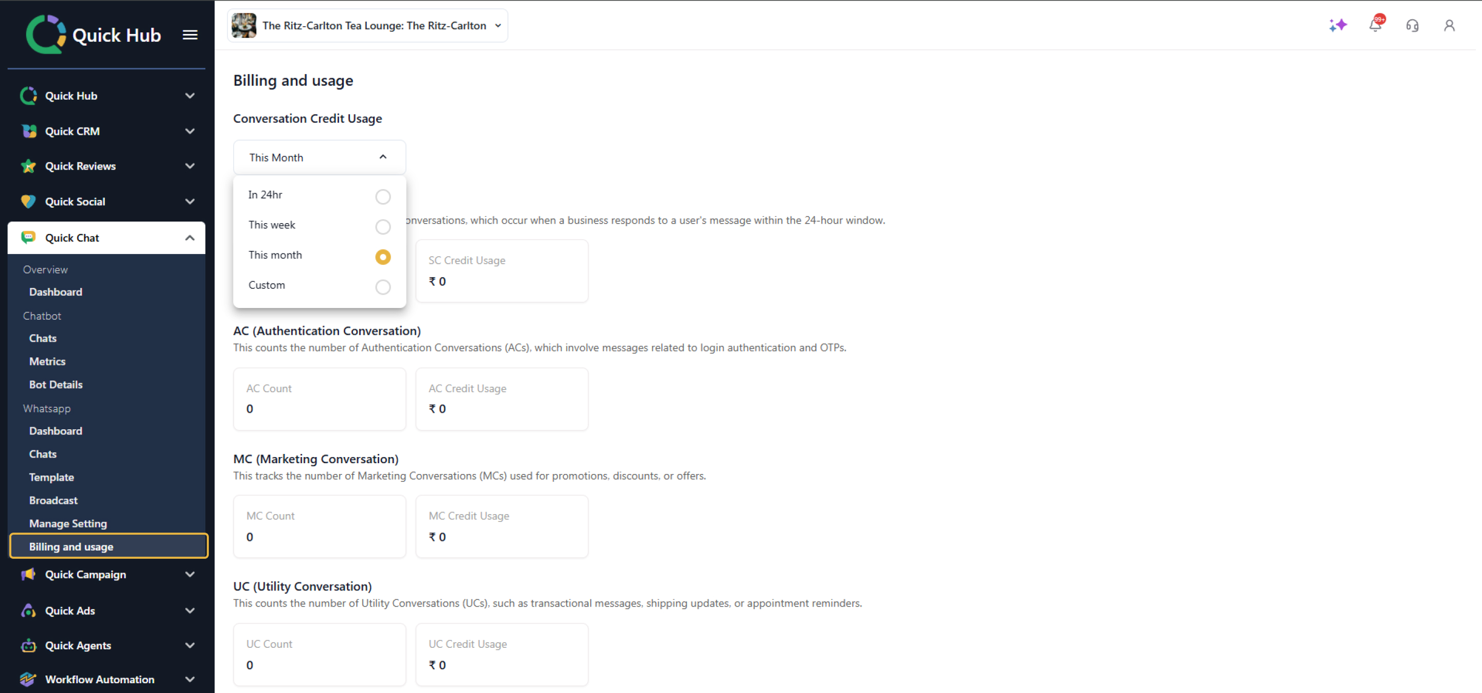 - To check the billing and usage of the WhatsApp chatbot, go to ‘Billing and Usage’ under Quick Chat. You can check usage for 24 hours, the current week, the current month, or a custom date.