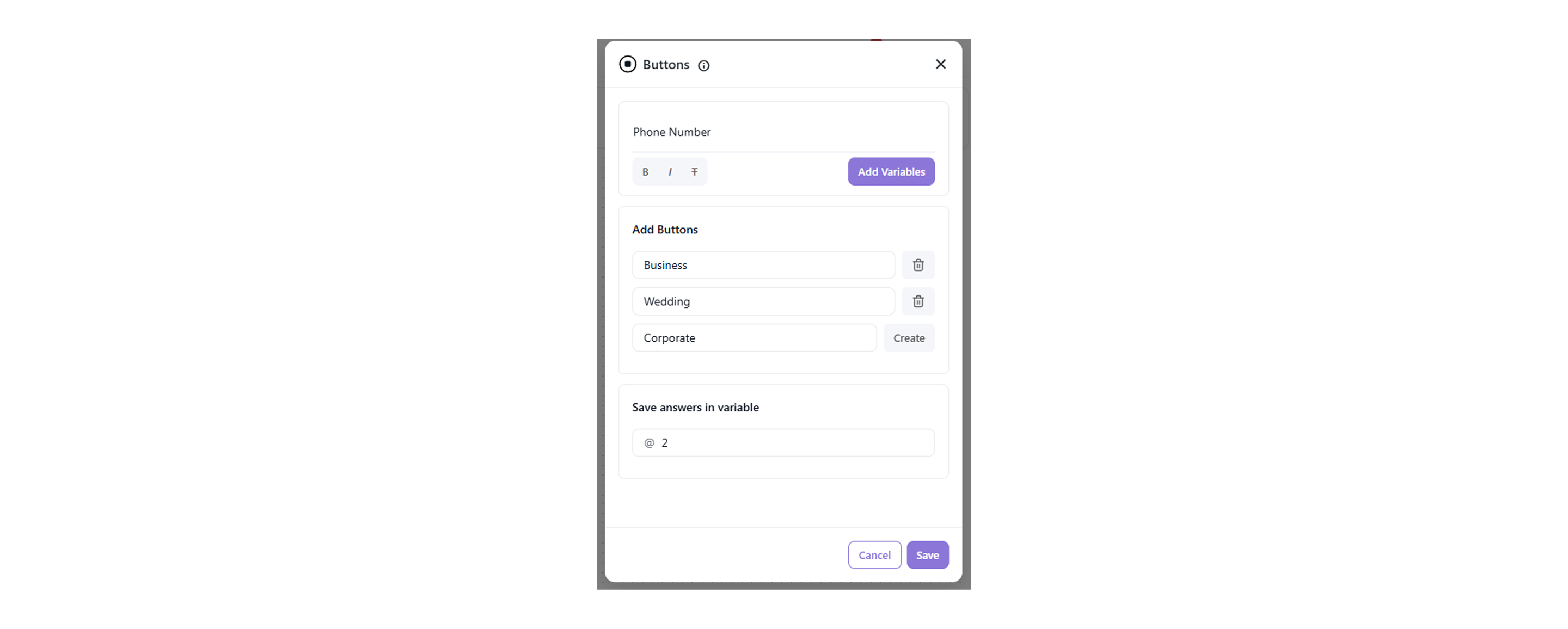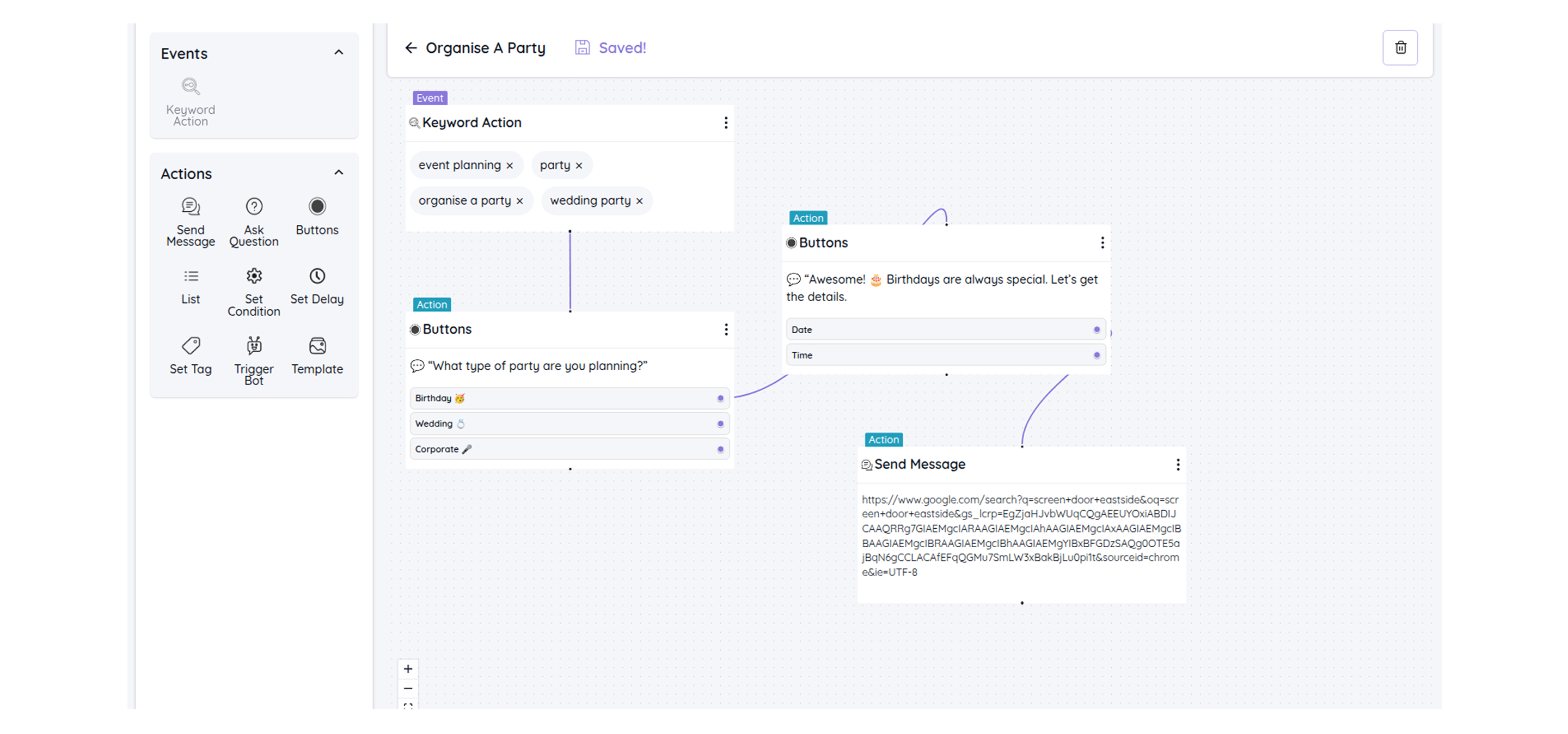 - Type the question and its responses that you want the bot to ask for the above keyword action.